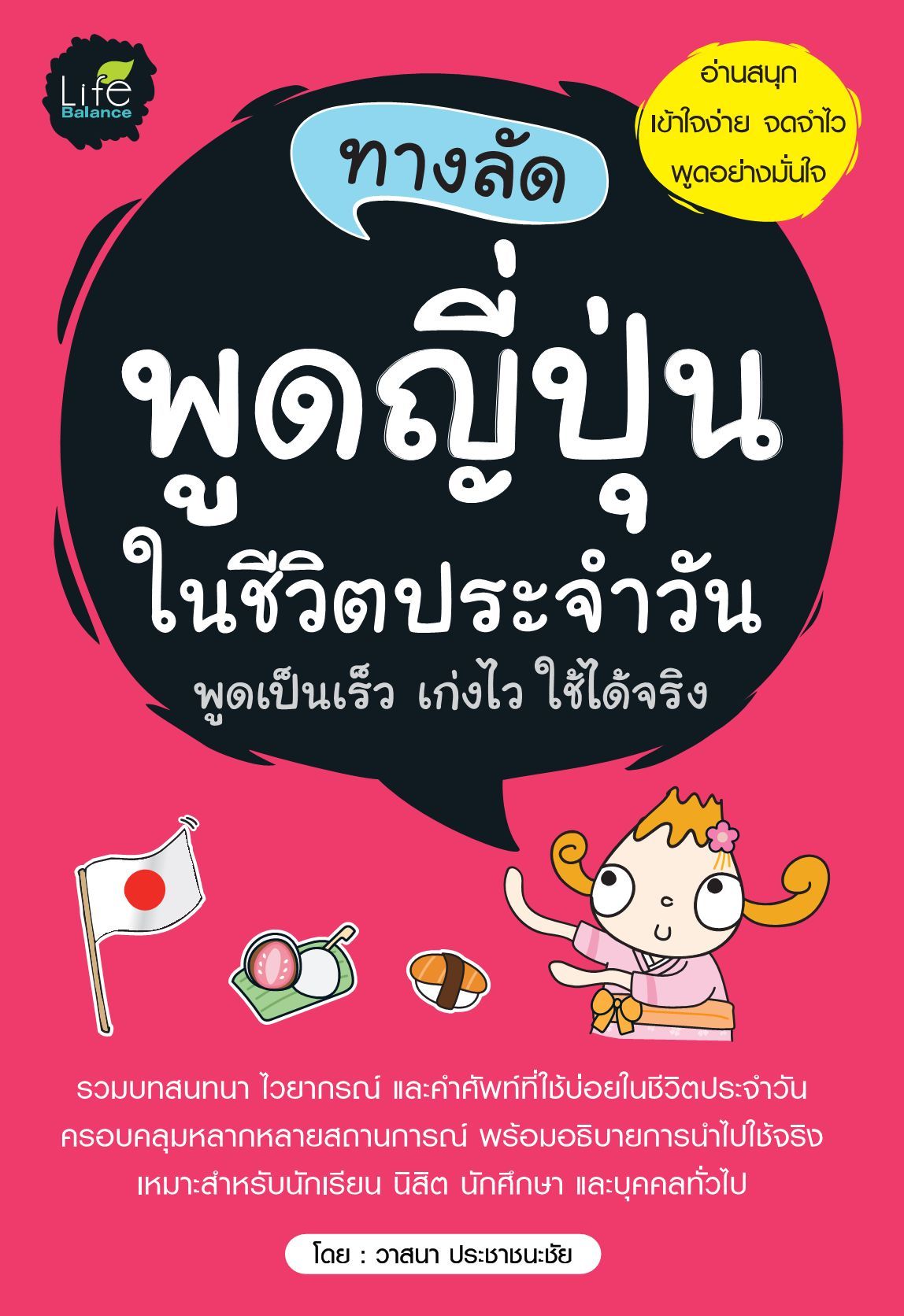 เนื้อหาย่อ : ทางลัดพูดญี่ปุ่นในชีวิตประจำวัน เล่มนี้ เป็นการรวบรวมประโยคในการพูดภาษาญี่ปุ่นและบทสนทนาภาษาญี่ปุ่น พร้อมคำอ่านออกเสียงโรมันจิ คำอ่านภาษาไทย และคำแปล ตลอดจนคำศัพท์ที่จำเป็นต่อการสื่อสารในสถานการณ์ต่าง ๆ ไว้อย่างหลากหลาย โดยภายในเล่มจะมีการแบ่งเนื้อหาออกเป็นบทต่าง ๆ เป็นหมวดหมู่ตามสถานการณ์จริง เพื่อให้ผู้อ่านได้เรียนรู้และจดจำวิธีการพูดภาษาญี่ปุ่น ที่สามารถนำไปใช้ได้จริงในชีวิตประจำวันและในการเรียนการสอบอย่างง่ายดาย เหมาะสำหรับนักเรียน นิสิต นักศึกษา และบุคคลทั่วไป